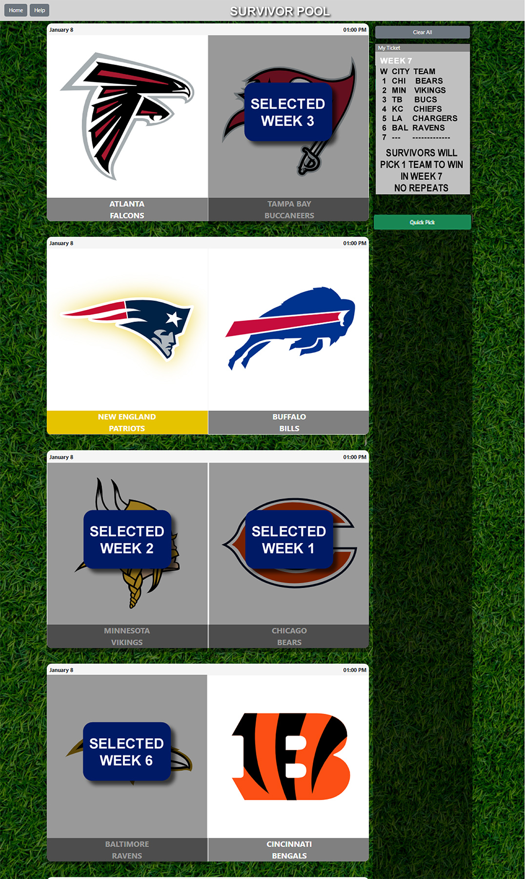 Our Survivor Pool is an elimination-style promotion where participants select one team to win each week. If their chosen team wins, they advance to the next round; if they lose, they are eliminated from the pool. The key challenge is that each team can only be picked once per season, making strategy and long-term planning crucial.